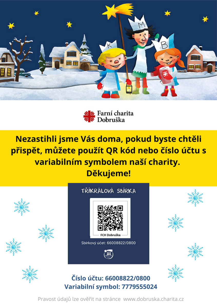 Tříkrálová sbírka vznikla na základě staré lidové tradice, která má svůj původ ve středověku, kdy se ve městech a na vsích hrály hry o Třech králích. Představení vyprávěla biblický příběh o mudrcích z východu, kteří se přišli poklonit Ježíškovi v jesličkách v Betlémě a předali mu své dary – kadidlo, myrhu a zlato. Chudé děti pak chodily 6. ledna oblečené za Tři krále po domech s betlémskou hvězdou a kadidlem, zpívaly lidem koledu „My tři králové“ a posvěcenou křídou psaly na dveře domů K † M † B † s příslušným letopočtem. Pojďte společně s námi uctít a udržet tuto tradici.